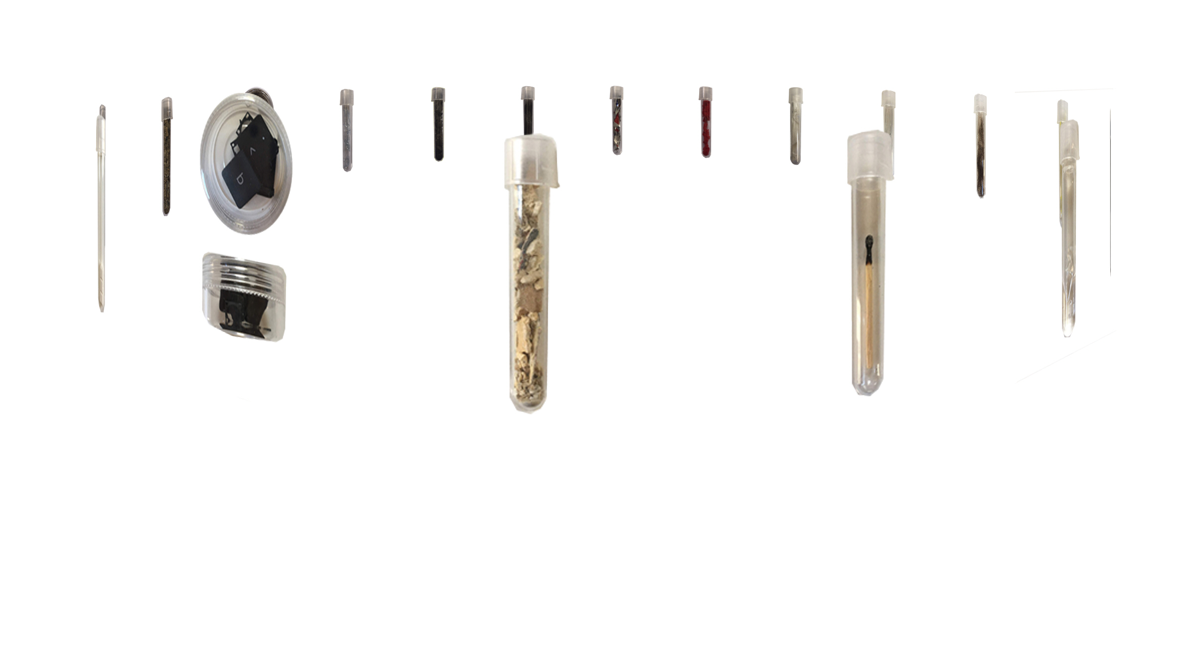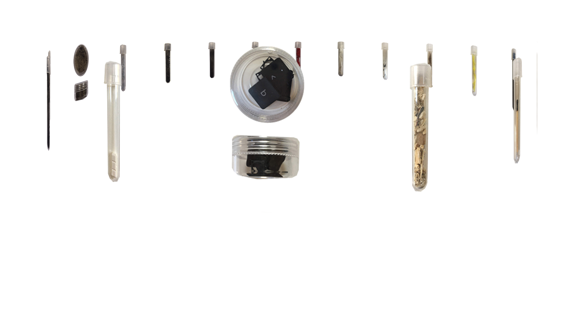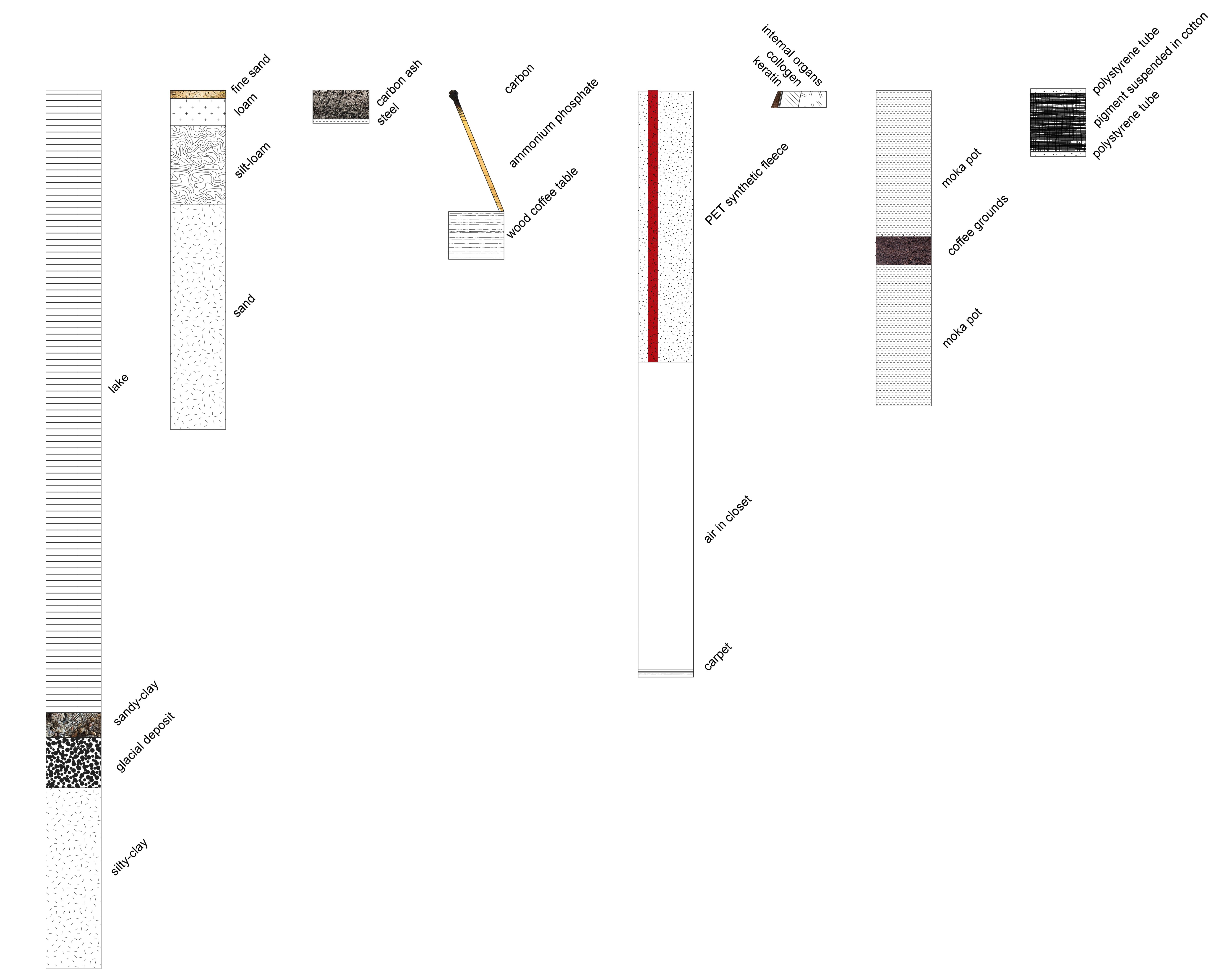 We use the methods of soil sampling, but we are sampling our own material realities, not the necessarily soil as in, surface geology. These material realities tell a story of the mundane recent past. These are intentionally arbitrarily gathered samples from our lives. This is anthropocene at the scale of Mary and Meg. In doing sampling at the scale of ourselves, we break our own rule, we do not follow the section cut or the antipode, but we reveal what the planetary section forecloses. The haptic scale can only be measured at ourselves.